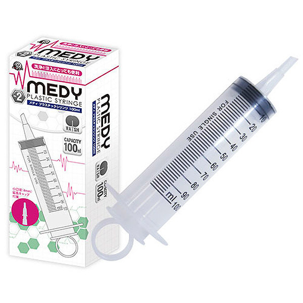 ●医療系グッズのMEDYシリーズ●お手軽なプラスチック製●容量たっぷりの100ml●注入量が一目で分かる目盛り入り●片手でも簡単に注入できるリング付き●小口径の延長キャップも付属。