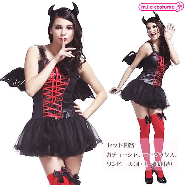 ハロウィンの定番コスプレと言えば悪魔の仮装!羽と尻尾が付いた光沢感の美しい艶やかなエナメル風ワンピースと、角付きカチューシャ、黒いリボンが装飾されたニーソックスのフルコーデセット。