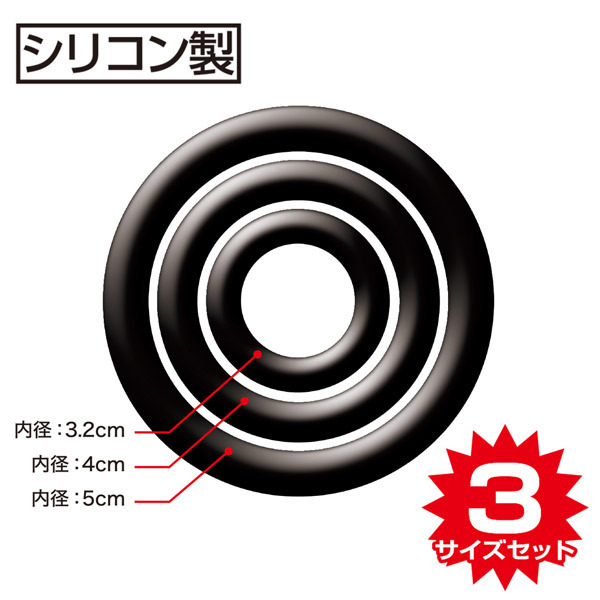 ●サイズの異なる黒リング3個セット●内径:大5cm・中4cm・小3.2cm●高品質なシリコン素材を使用●伸縮自在で肌触りも良く装着感抜群。
